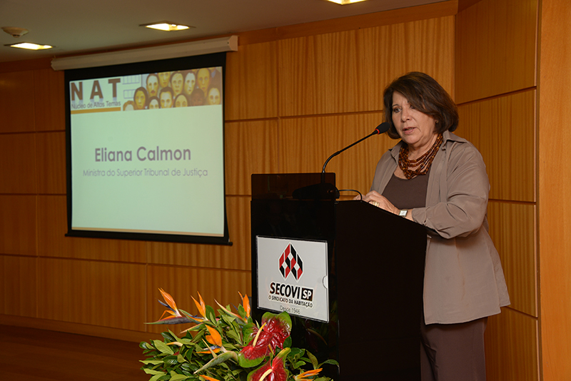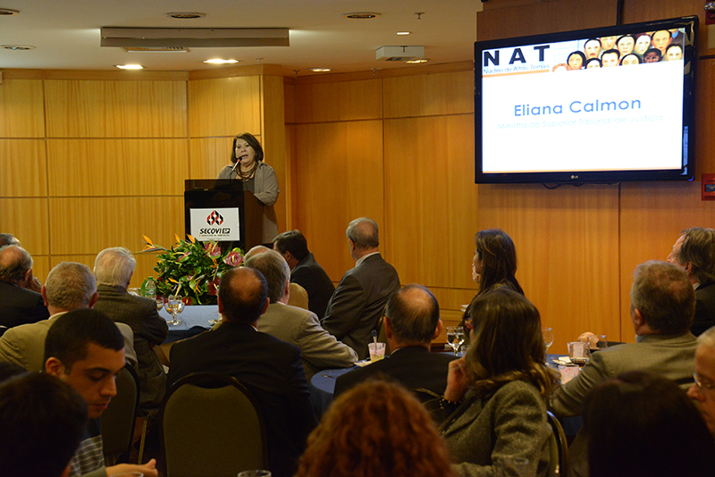 Eliana Calmon Alves, a primeira juíza togada a fazer parte de um tribunal superior e a primeira mulher a integrar o Conselho Nacional de Justiça, foi a convidada do Núcleo de Altos Temas, NAT, para reunião realizada na sede do Secovi-SP em 17 de junho, sob o tema “Juízes e Justiça: Como aperfeiçoar o Poder Judiciário”. Seu nome foi catapultado à cena nacional após ter descortinado para toda a sociedade o problema da impunidade na magistratura. “Neste País tão carente de líderes que defendam a moral indispensável ao processo civilizatório, a ministra Eliana Calmon se destaca de uma forma até mesmo consoladora”, disse o presidente do Secovi-SP, Claudio Bernardes.