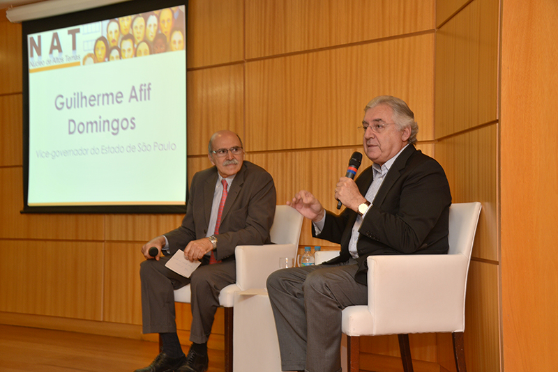 Antes do início da apresentação de Afif, Romeu Chap Chap, coordenador do NAT, lembrou a trajetória do palestrante. “Estar com Guilherme Afif é um privilégio. Ele sempre tem algo inovador para apresentar. É um homem de ideias e ação. Formado pela administração de empresas pela Faculdade de Economia do Colégio São Luis, Afif presidiu por duas vezes a Associação Comercial de São Paulo, onde criou o Fórum de Jovens Empreendedores, e a Federação das Associações Comerciais do Estado de São Paulo (FACESP), nas gestões 1982 a 1987 e 2003 a 2007”, disse, citando, também, seus feitos no Badesp (Banco de Desenvolvimento do Estado de São Paulo), no PL (Partido Liberal) e no Sebrae.